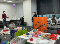 4階子ども企画に参加し、室内プレーパークを開催しました。子どもたちは新聞紙をちぎったり、ロールペーパーを身体に巻き付けたりして思いっきり遊びました。たくさんの親子連れの参加があり、何度も訪れる子どももいました。